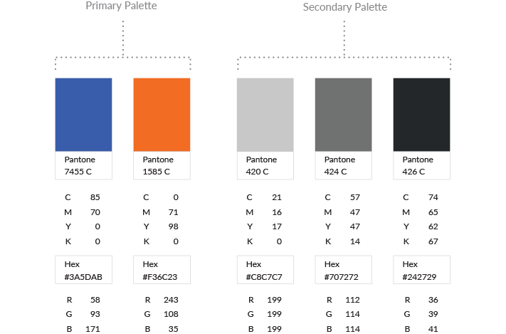 The palette represents the spectrum of acceptable brand identity colors and should be used for all types of media. The primary palette represents the colors that should be used the most and the secondary palette represents the colors that should be used as accents. No other colors should ever be used.